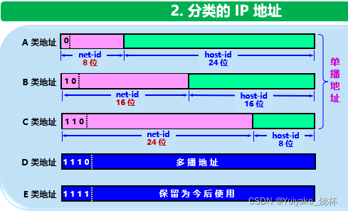- 特点:网络前缀+主机号,IP地址是标志一台主机和一条链路的接口