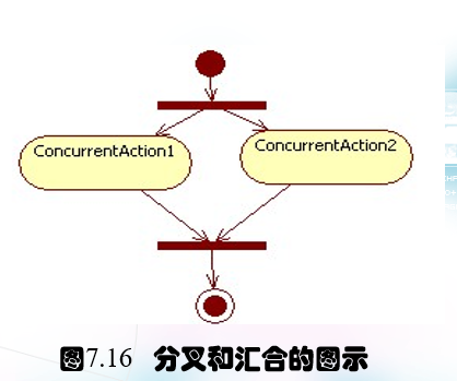 - 分叉和汇合:表示并行发生的事件流,汇合用于同步并发分支,每个汇合可以有2or多个输 入转换和一个输出转换,分叉用来描述并发线程。